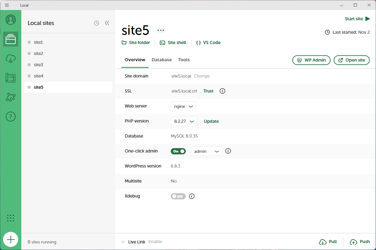 Local WP 是由 WP Engine 推出的免费本地开发工具,专门为 WordPress 优化。它能在你的电脑上创建多个本地网站环境,支持 PHP、MySQL、nginx/Apache 的快速切换,并自带一键 SSL、本地邮件捕获、站点克隆等高级功能。